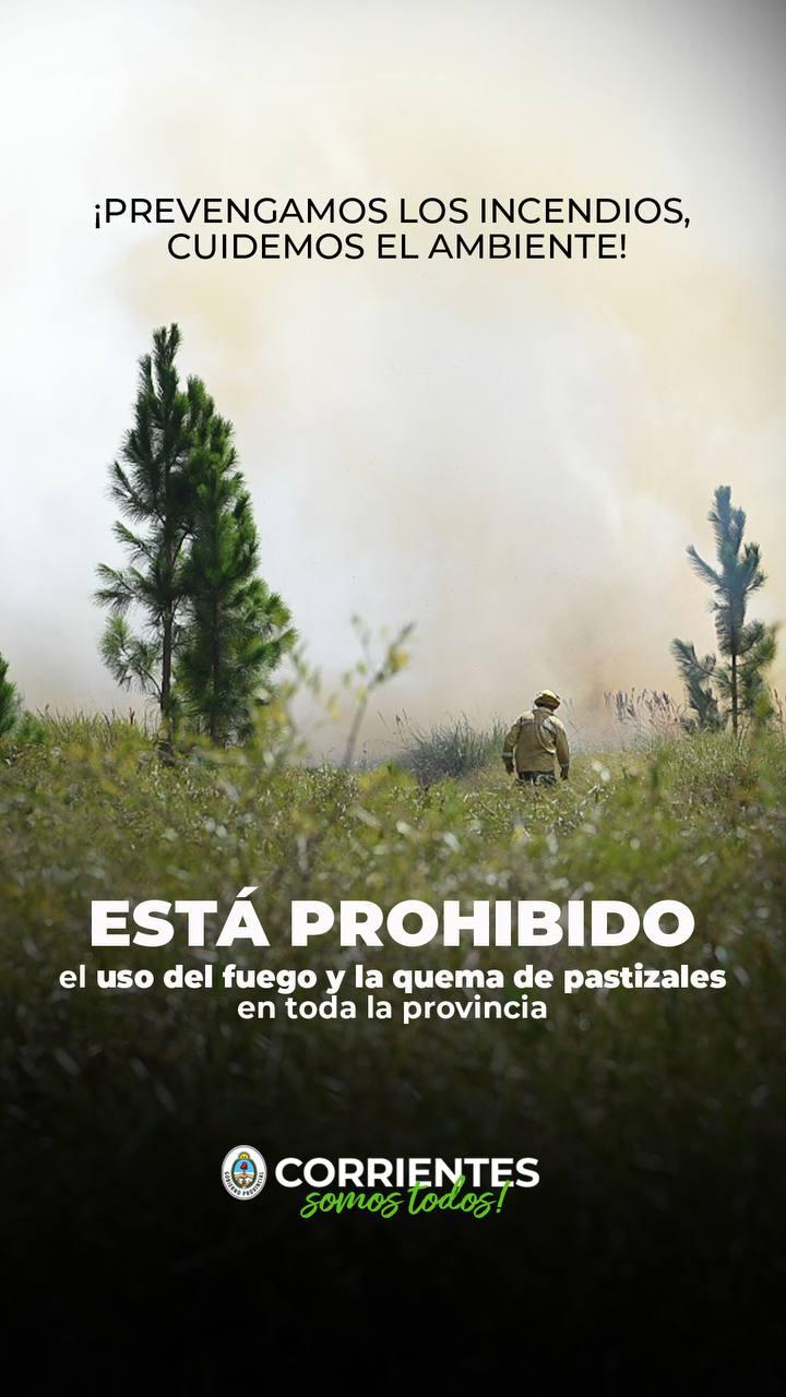 El Gobierno de Corrientes comunicó a través de sus diversas redes que «está prohibido el uso de fuego y quemas de pastizales en toda la provincia». La advertencia se enmarca en lo determinado por la Secretaría de Desarrollo Forestal por medio del índice de peligro de incendios que establece ante la situación climática, el cual para las distintas regiones del territorio provincial se sitúa actualmente en «muy alto» y «extremo».