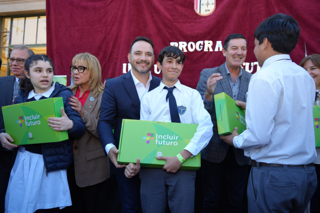 Práxedes López, ministra de Educación de la provincia y el intendente de Capital, Eduardo Tassano, encabezaron este martes un acto el cual entregaron computadoras a unos 706 jóvenes estudiantes de primero y segundo año de los colegios secundarios “General San Martín” y “Manuel Belgrano” de la ciudad.