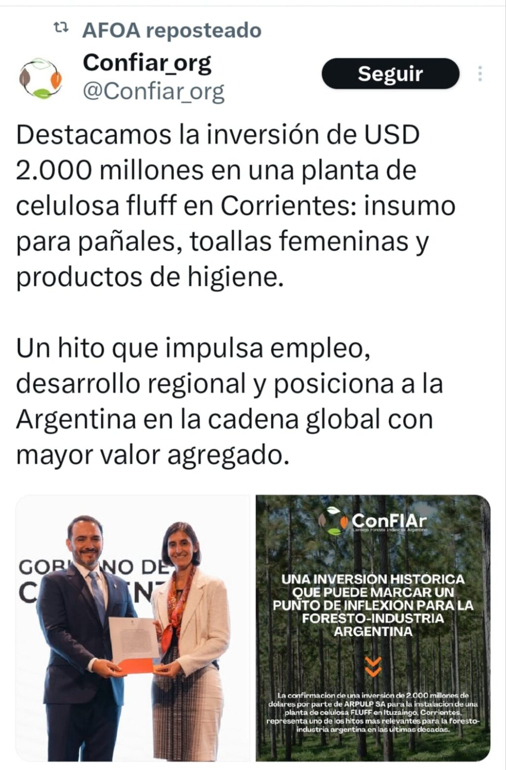 “Gran noticia para el país, para Corrientes y para el sector forestal”, pronunció la Asociación Forestal Argentina (AFoA) a través de sus redes sociales, remarcando que la iniciativa significa “producción, empleo y divisas con bioproductos sostenibles y bajos en carbono”.